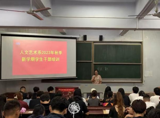 为进一步加强学生干部队伍建设,人文艺术系于2023年8月28日举办了2023年秋季新学期学生干部培训班开班仪式。系党总支副书记付文珍,学工办主任、团总支书记李英杰,全体辅导员老师,学生会、学生发展中心全体学生干部以及各班级班长团支书参加会议。