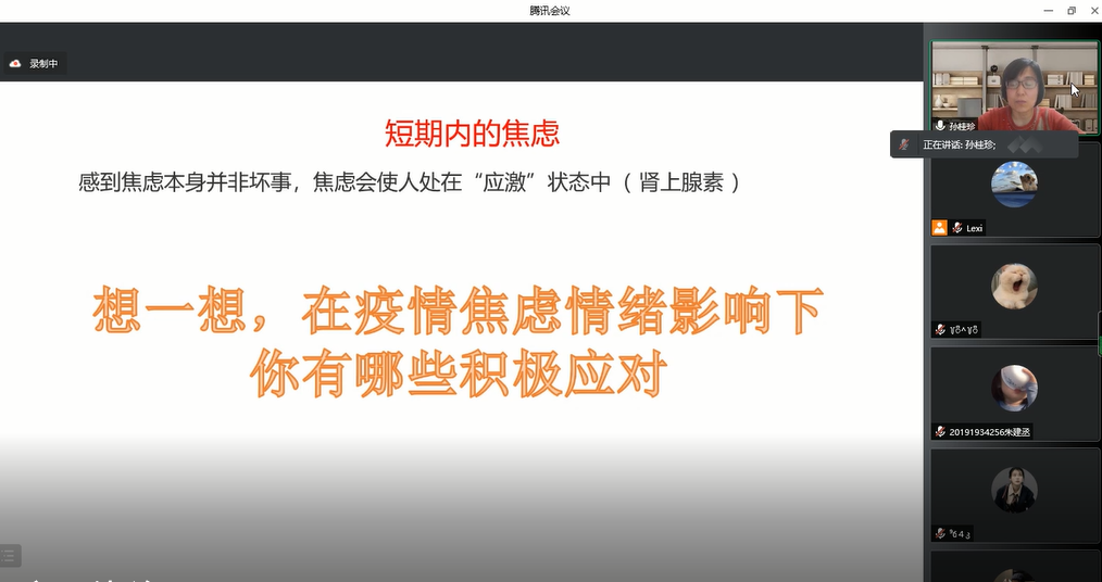 讲座的主题内容主要分为认识当下疫情状况、认识疫情发生后的应激反应、掌握疫情应对的心理措施三个部分。孙桂珍先从当前国内外疫情形势谈起,讲解了如何正确认识当下的疫情状况。然后从心理学的角度,深入浅出地讲解疫情发生后的容易出现的应激反应,引导同学们掌握应对疫情采取的正确的心理调节措施。最后,从学习目标树立、学习计划制定、学习习惯养成等方面,讲解疫情期间如何劳逸结合,提高学习效率。