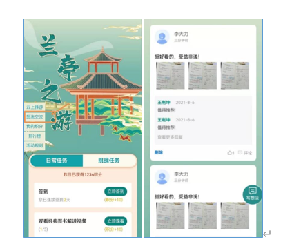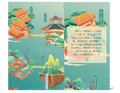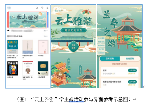 云上雅游:活动借鉴四个古代文人经典雅集(即“文人聚会”)——邺下雅集、兰亭雅集、西山雅集、玉山雅集,设置四个园林,每个园林点击进去是不同的任务页,读者进入任务页面做看书、看视频、交流想法等任务,每两天解锁一个园林。