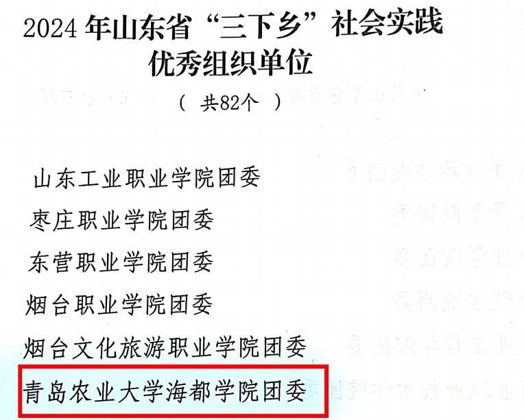 近日,中共山东省委宣传部、山东省教育厅、共青团山东省委、山东省学生联合会联合发布《关于“调研山东”—2024年山东省大中专学生志愿者暑期“三下乡”社会实践活动的通报》,对2024年暑期“三下乡”社会实践活动给予通报表扬。我校团委被评为优秀组织单位,我校现代设计学院“‘农’墨重彩绘振兴”赴姜疃镇实践服务团被评为“优秀服务团队”;王慧鑫老师被评为“优秀指导教师”;现代设计学院周怡菲同学被评为“优秀学生”。