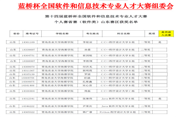 蓝桥杯大赛旨在培养有创新能力和实践能力的高端人才,提升高校毕业生的就业竞争力。本次比赛,我校通过校内选拔赛,最终选出21名参赛选手与来自全省近百所院校选手进行省赛个人赛角逐,最终有14人获奖,其中张继伟、李炫谊2人获得一等奖;孙嘉、崔剑烁、李胜锋、付洪尤、郭明霞、罗波、尹荣庆获得二等奖;彭涵、孔维鑫、宋心语、周磊、韩广睿获得三等奖。我校教师韩辉、王朝娜、牟莉莉、位晓晓被评为优秀指导教师。