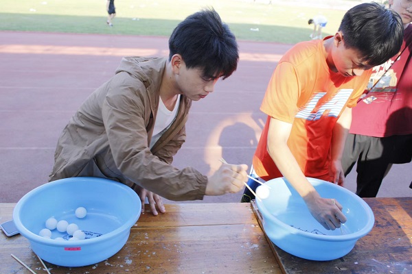 本次趣味运动会共设有四个项目,分别为两人三足、托网球接力跑、夹乒乓球接力和水球争夺战。其中水球争夺战项目深得同学喜爱,在炎热夏天中,同学们五人一组,在草坪上找到水球并放到指定地方,在运输自己水球的同时也可以破坏其他队伍的水球。此项目充分考验了团队协作能力、展现了团队激情、传递向上奋发精神。每个运动项目都将新颖的活动形式和内容相结合,整个活动在激情、热烈、和谐的气氛中顺利结束。
