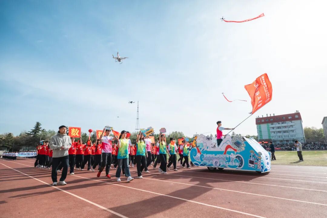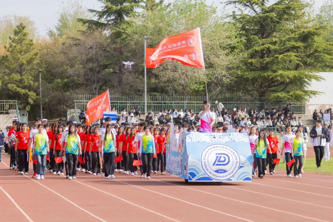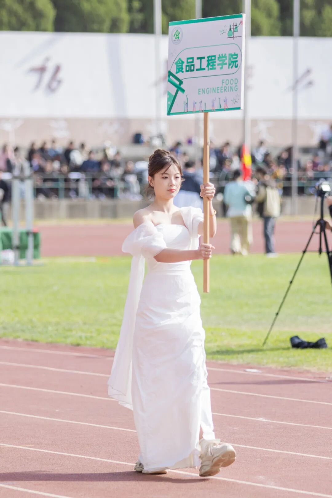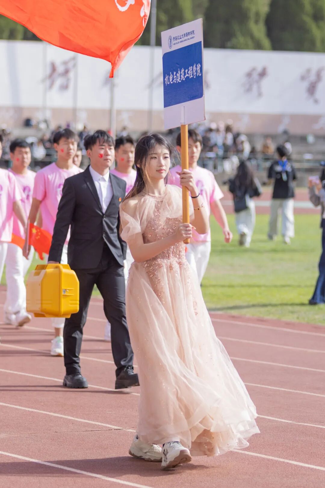 开幕式上,伴随着激昂的运动员进行曲,各代表队依次入场。国旗护卫队步履铿锵,彩旗队迎风列阵,裁判员方队庄严行进,信息工程学院无人机编队翱翔碧空划出科技轨迹,现代设计学院手持亲手设计绘制的学校特色建筑巨型画卷徐徐铺展,生物工程学院与萌宠相伴展现生命科学魅力,食品工程学院托举膳食宝塔模型诠释食安之道,经济与管理学院手持算盘敲响数字时代的韵律,机电与建筑工程学院展示精密仪器铸就匠心精神。各方队创意迭出、亮点纷呈,以独特方式展现专业风采与体育精神,共同拉开本届运动会的华彩序幕。