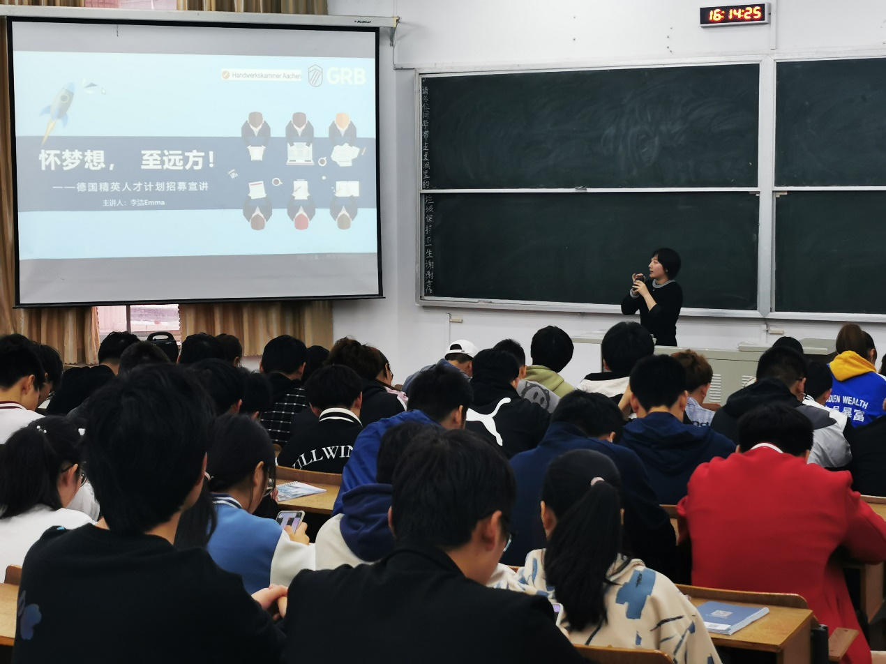 宣讲活动现场中,两位老师还结合自身多年德国学习、工作的经验,向学生介绍了德国文化、德国企业福利待遇、工作环境等内容。并通过精英计划真实学生案例,激发学生们对德国的兴趣,启迪学生对职业生涯的规划。