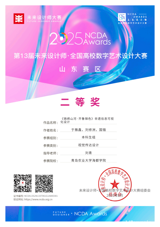 近日,2025年第13届未来设计师・全国高校数字艺术设计大赛(NCDA)山东赛区获奖名单正式公布。由教务处组织推荐,现代设计学院参赛队伍经过激烈角逐,共斩获一等奖2项、二等奖5项、三等奖1项,4位教师获评“优秀指导教师”,充分展现了我校艺术类专业人才培养的过硬质量与师生风采。